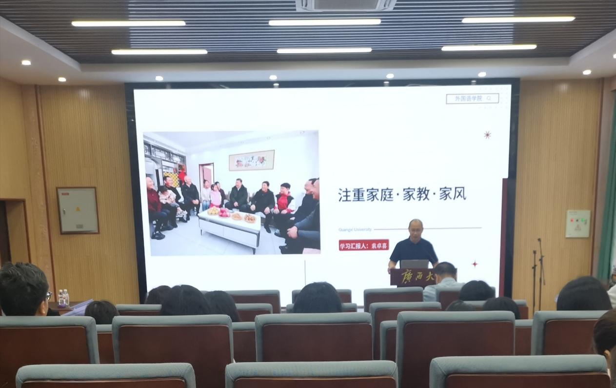 学院党委委员袁卓喜以《注重家庭 家教 家风》为题,围绕习近平总书记关于注重家庭、注重家教、注重家风建设的重要论述,阐述了家庭的重要性、家庭与国家的关系、家教的重要性、家风对家庭的影响、家庭文明建设实践等方面的内容。他表示,对于党员干部而言,家风不仅关乎个人家庭幸福,更关系到党和政府在人民群众心中的形象,党员干部要以身作则,带头树立良好家风,以良好的家风带动党风、政风的持续好转。